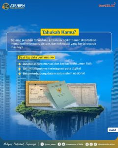 Ia menjelaskan, selama puluhan tahun lalu, jutaan sertipikat tanah diterbitkan mengikuti ketentuan, sistem, dan teknologi yang berlaku pada masanya. Namun saat ini, data pertanahan dicatat secara manual dan berbasis dokumen fisik, belum sepenuhnya terintegrasi dalam peta digital, serta belum terhubung dalam satu sistem nasional.