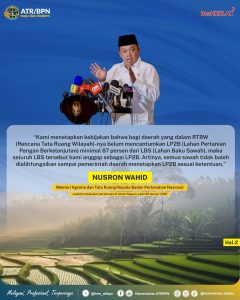 “Jika dalam RTRW belum tercantum LP2B minimal 87 persen dari LBS, maka seluruh LBS kami anggap sebagai LP2B. Artinya, seluruh sawah tidak boleh dialihfungsikan hingga pemerintah daerah menetapkannya sesuai ketentuan,” ujar Nusron.