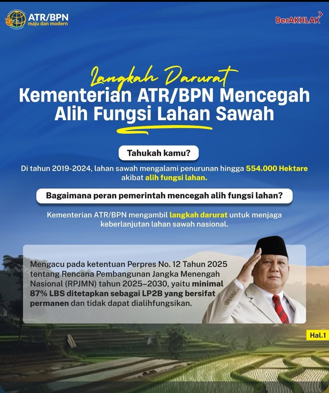 NUSANEWS.CO.ID – JAKARTA – Kementerian Agraria dan Tata Ruang/Badan Pertanahan Nasional (ATR/BPN) menetapkan langkah darurat untuk mencegah alih fungsi lahan sawah yang berpotensi mengganggu ketahanan pangan nasional.