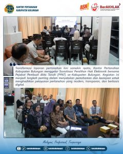 “Kami berharap PPAT sebagai mitra strategis dapat menjadi garda terdepan dalam menyukseskan layanan elektronik ini, sehingga pelayanan pertanahan di Bulungan semakin efektif, transparan, dan modern,” ujar salah satu pejabat Kantor Pertanahan Kabupaten Bulungan.