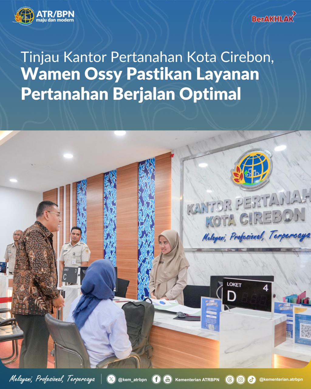 “Kantah merupakan garda terdepan pelayanan Kementerian ATR/BPN. Oleh karena itu, seluruh proses layanan harus mampu memberikan kepastian hukum sekaligus kemudahan bagi masyarakat,” ujar Ossy Dermawan kepada jajaran Kantah Kota Cirebon.